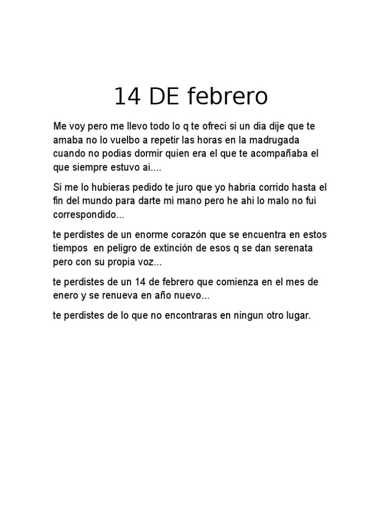 Te perdiste de un 14 de Febrero que comienza el mes de Enero y se renueva el año nuevo. Letra de En Peligro de. DO RE Te perdiste de un 14 de Febrero.